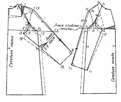 и ширину рукава по пройме (на рисунке штрихпунктирные линии) на 1-1,5 см и соответственно уувеличить глубину проймы спинки и полочки, а также ширину по боковым срезам.